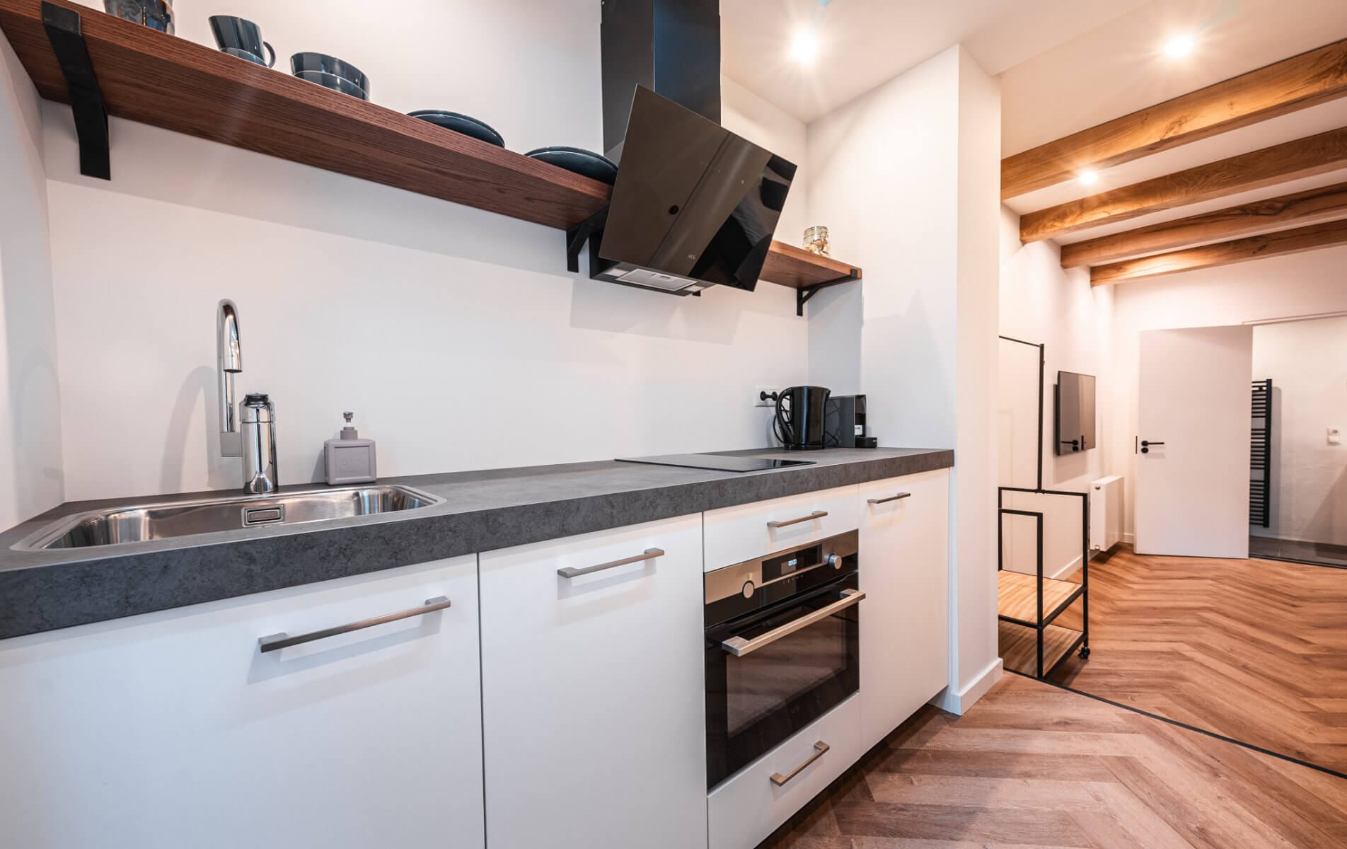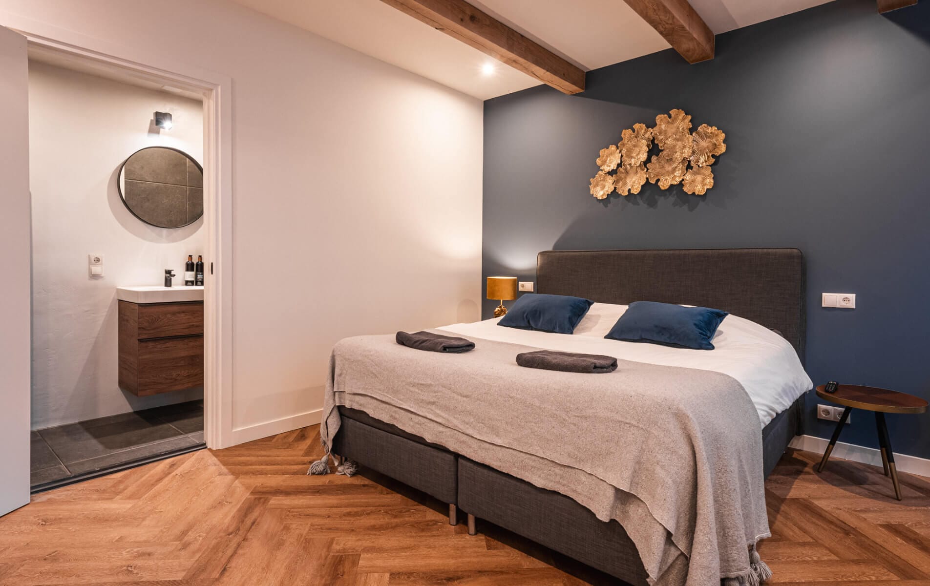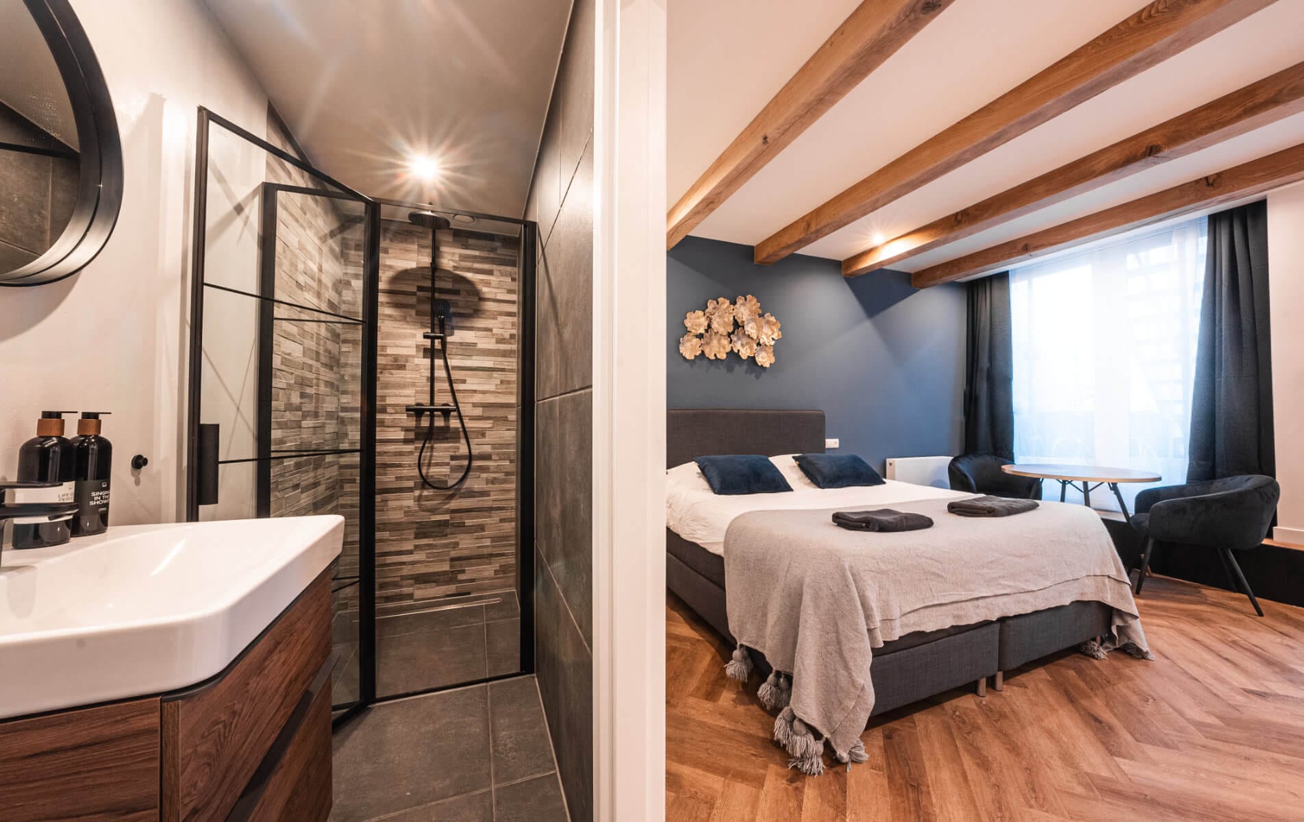 Een prachtige, gerenoveerde tweepersoons studio op de begane grond van ons hotel. De studio beschikt o.a. over een kingsize bed, regendouche, fijn zitje en een keuken. Deze hypermoderne, sfeervolle studio gaat zeker bijdragen aan een geweldig verblijf. Het mooie eiken balkenplafond en de prachtige badkamer met regendouche zorgen voor een luxe en onvergetelijke ervaring.